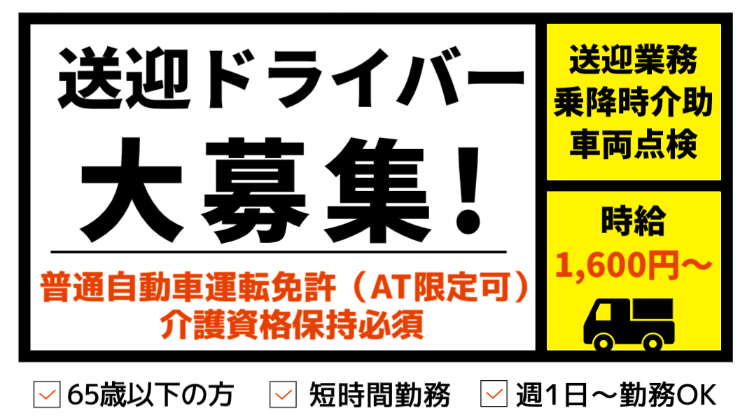 ご利用者様の送迎と乗降時の介助業務を行っていただきます(1回あたりの送迎3~10名)